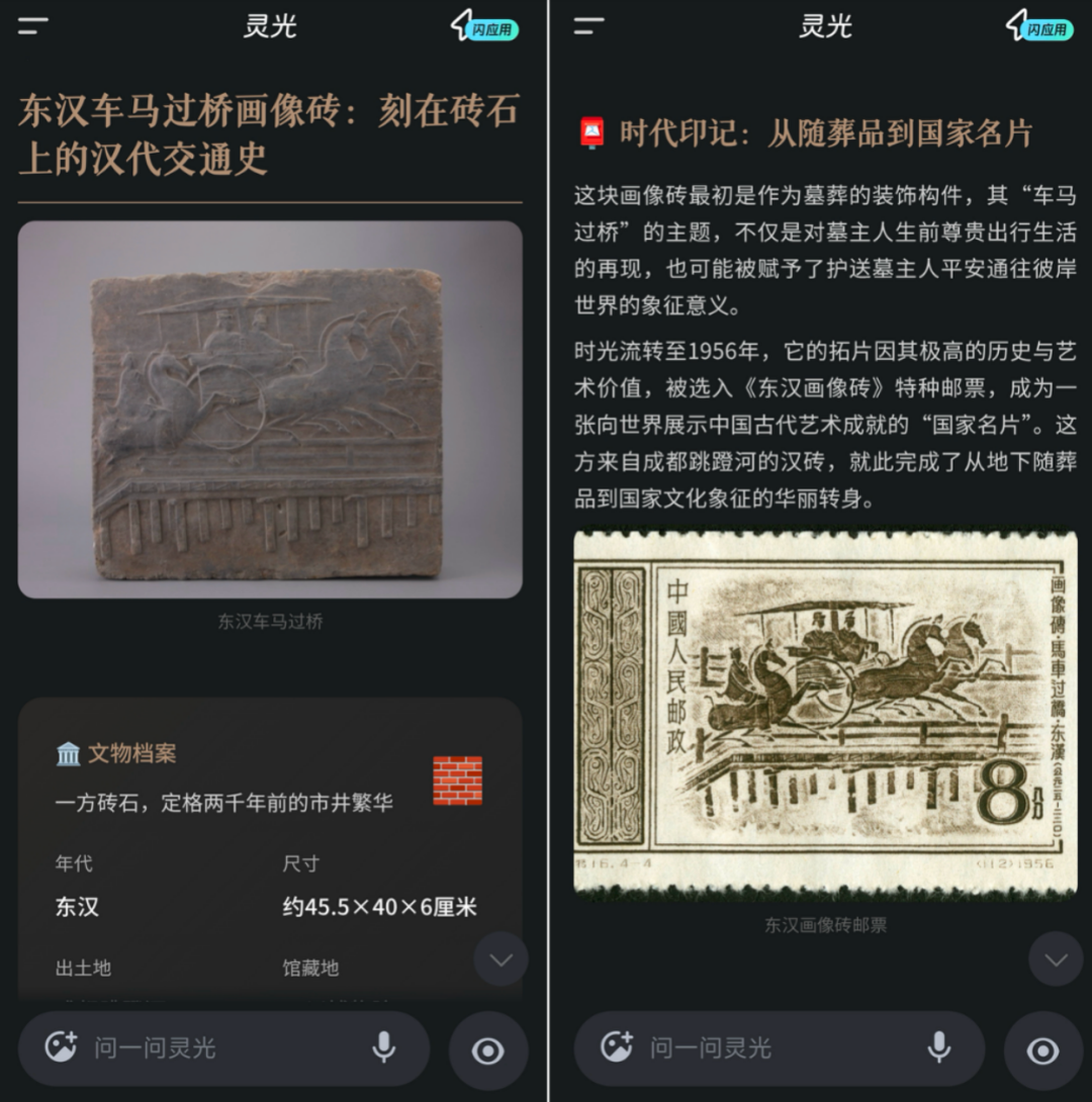 问了一句“这有什么马年国宝”,20秒后,手机上弹出一份“打卡攻略”——哪件文物在哪个展厅、怎么走最近,全给标好了。按图索骥找到那件东汉车马过桥画像砖。打开App的“开眼”功能,镜头对准文物,屏幕上立刻蹦出解释:“这块出土于成都跳蹬河的东汉画像砖,用浅浮雕的手法,将一队车马疾驰过桥的瞬间永恒定格。它不仅是汉代艺术的杰作,更像一扇窗,让我们得以窥见近两千年前蜀地繁忙的交通、精湛的桥梁技术。”
