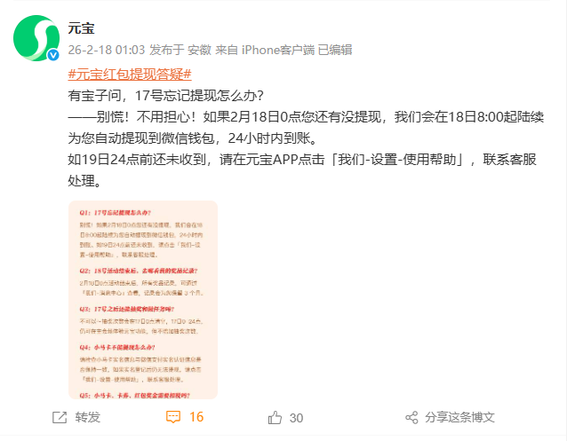 对此,元宝官方微博2月18日发布#元宝红包提现答疑#,给出暖心解决方案。