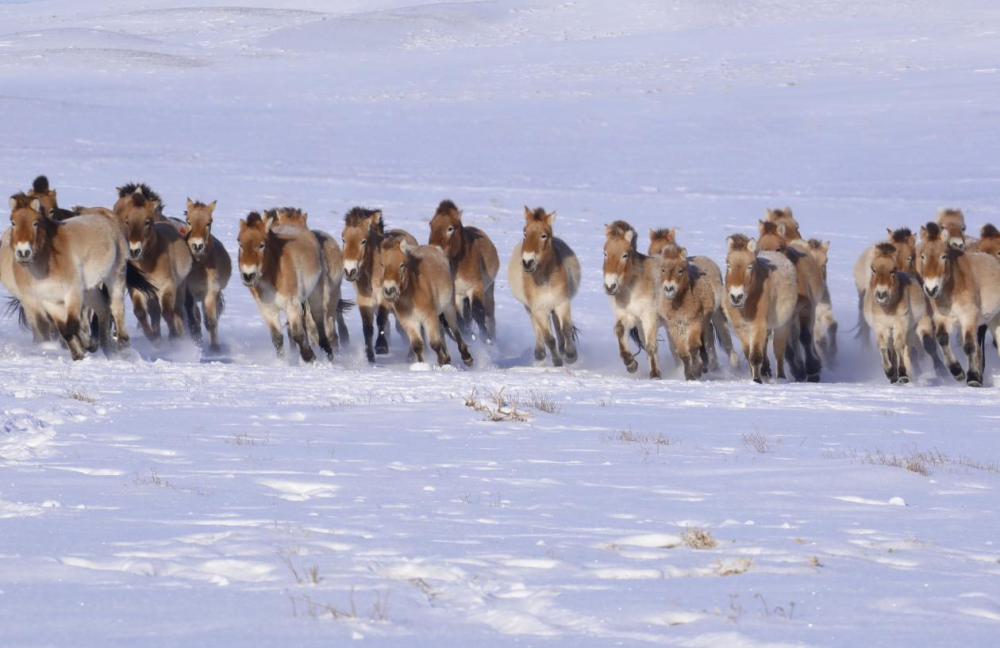 ▲驰骋在雪原上的野马。(中国科学院供图 张赫凡 摄)