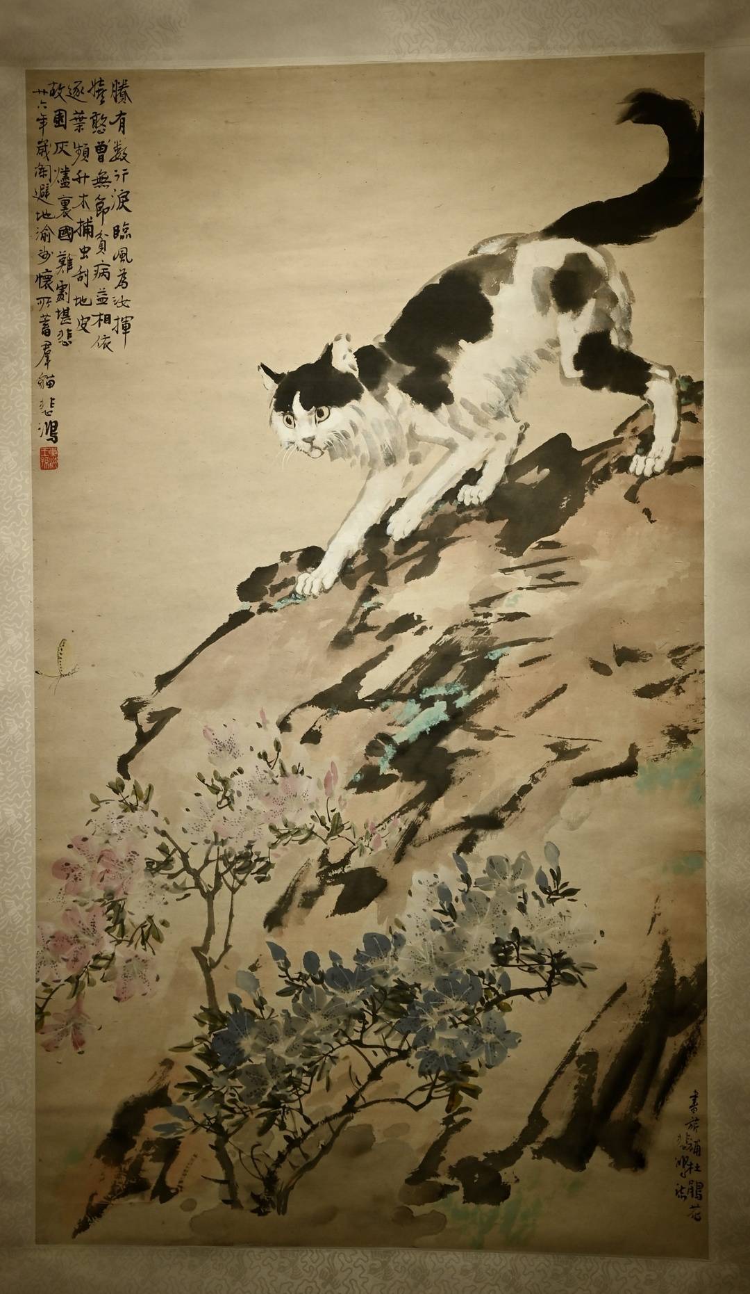 同时,作品除了画出了猫的颟顸外,还有正在绽放的浓烈艳丽的杜鹃花。花中藏着“彩蛋”,有兴趣的观众可以来找找看这些杜鹃花有何“蹊跷”之处。