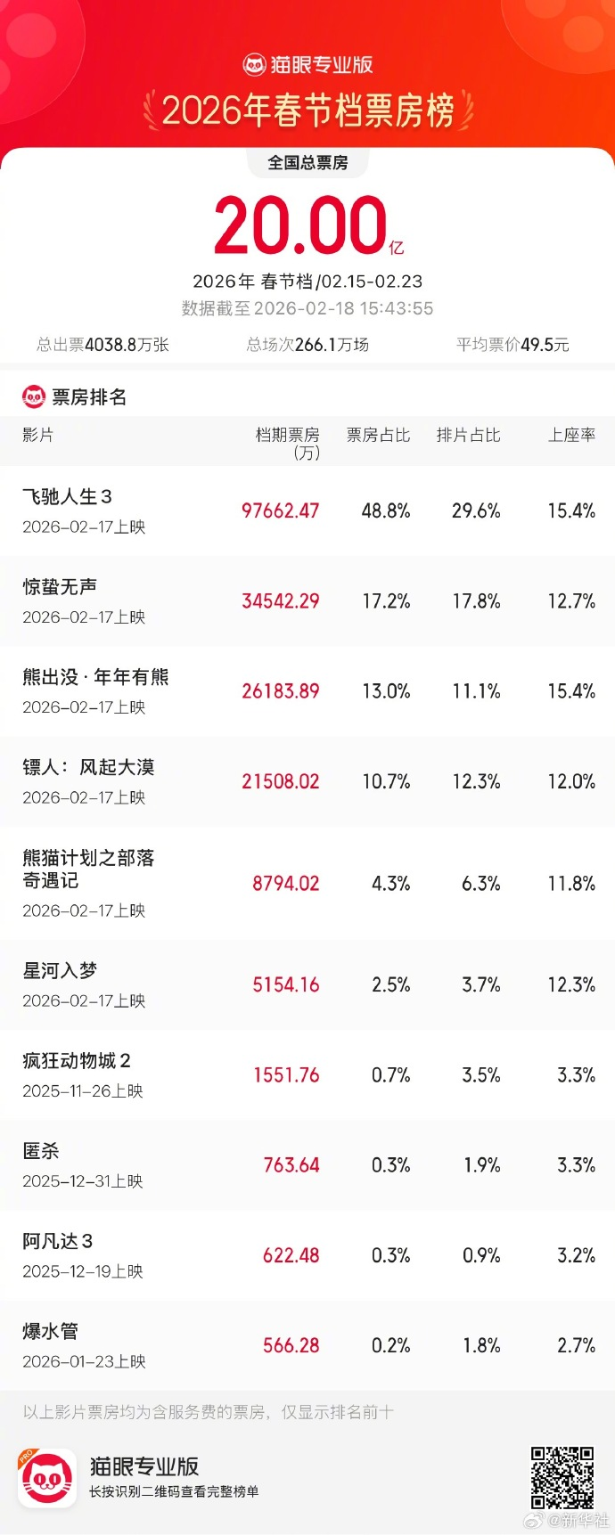 据网络平台数据,2026年春节档档期总票房(含预售)破20亿。《飞驰人生3》《惊蛰无声》《熊出没·年年有熊》分列前三位。