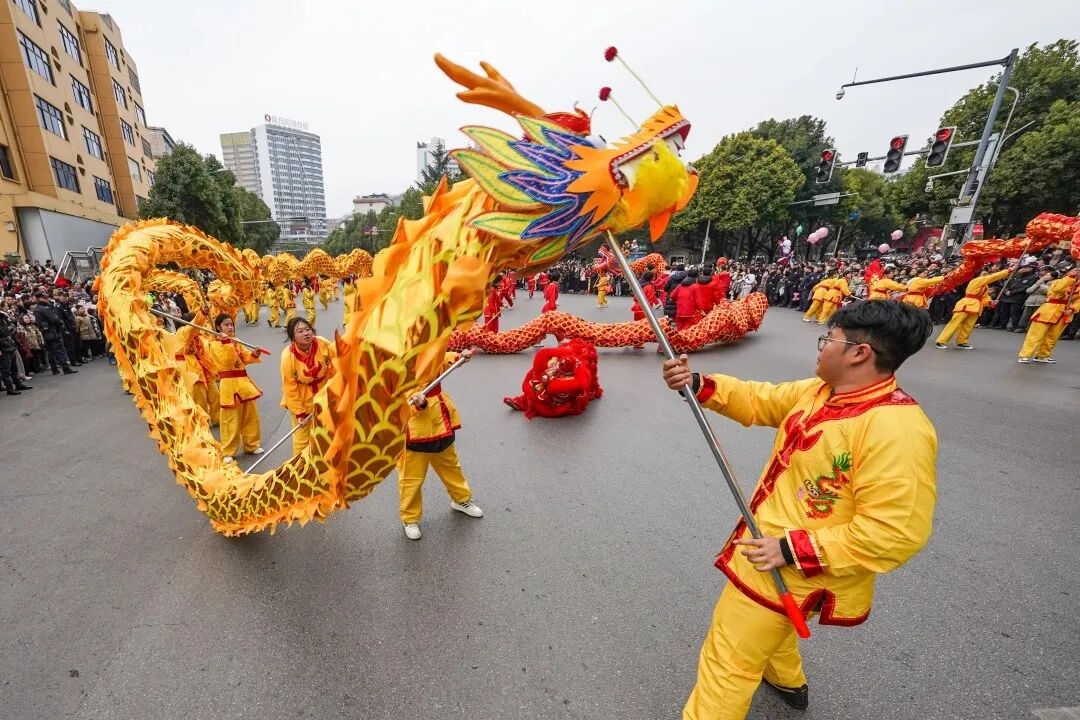 非遗活态展演,彰显本土文化底蕴。大方县“龙狮闹春·非遗贺岁”巡游活动,563名参演人员组成7大特色方阵,将非遗、民族、民俗元素深度融合;大方九洞天景区春节期间上演苗族“滚山珠”展演,演员身着盛装在八仙桌上完成高难度动作,尽显民族技艺的独特魅力;织金平远古镇非遗打铁花、潮汕英歌舞轮番上演,金沙、纳雍的舞龙打铁花技艺,呈现“火树银花不夜天”盛景,尽显非遗魅力。