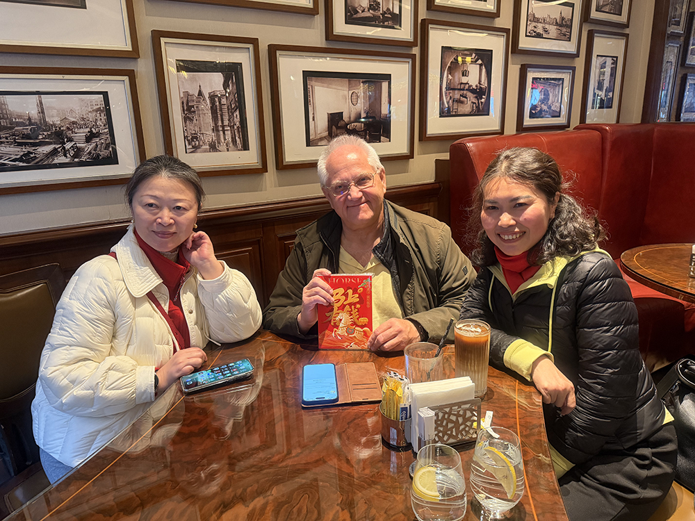 从左至右:春秋旅游副总经理周卫红,希腊领队Loannis Perrakis,英文导游Lucy。2月16日,马年除夕,希腊游客自由活动后,三个旅游人熟络地聊起了天。澎湃新闻记者 邹娟 图