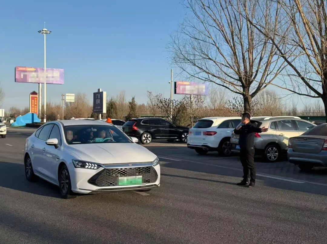 “跟我走,带你去车流交汇点。”刘靓江招手,前行百余米,在一处丁字路口站定,他加入保安行列,引导车流入场。宽阔路口上,房车、小客车、大巴车、长挂货车等不同车型有序行驶,全程有条不紊。