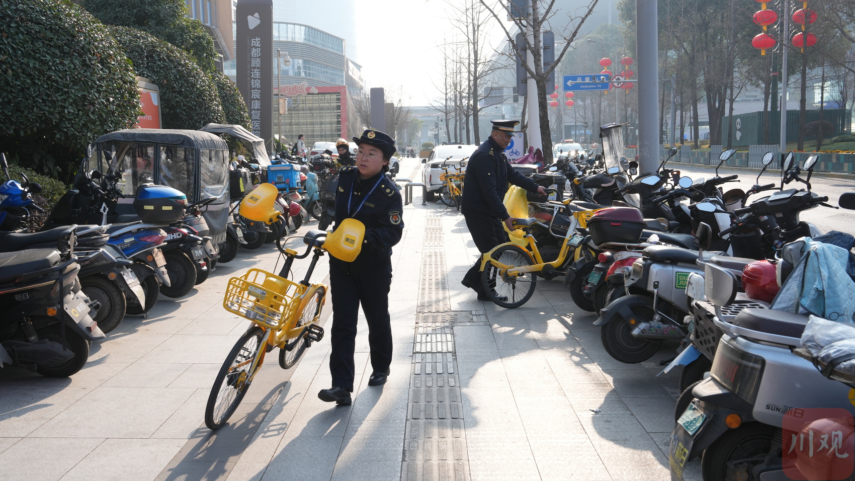 成都市城管执法总队火车站支队队员正在规范摆放共享单车