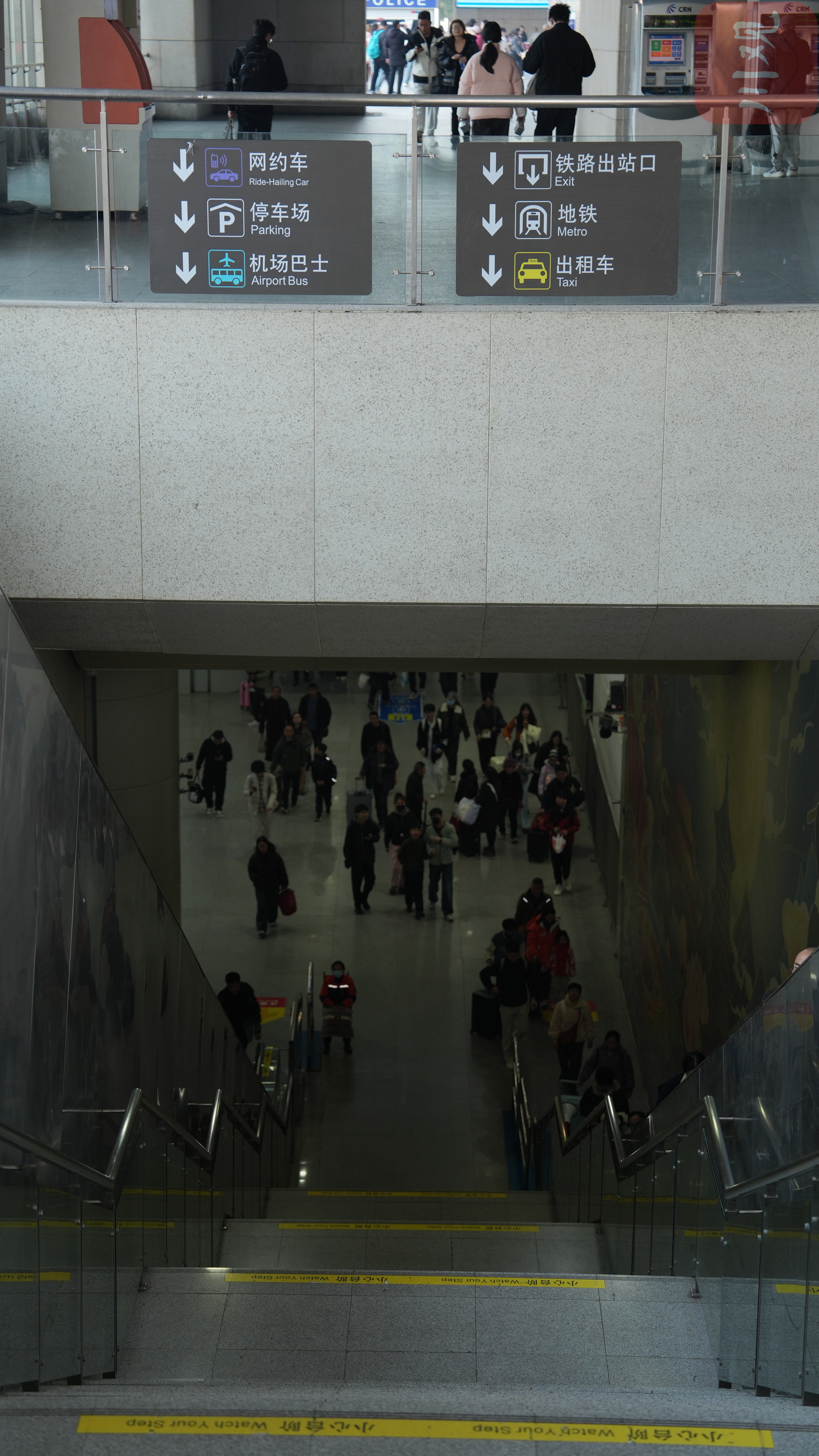 东广场电梯口,地面与负一楼人来人往