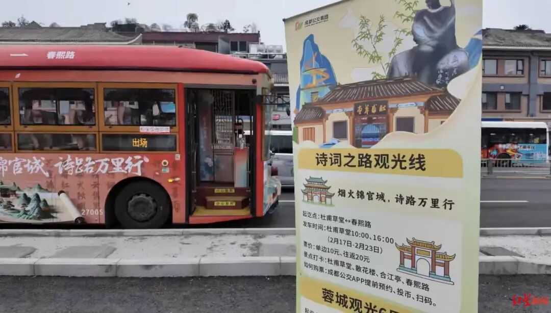 2月17日正式对外开放的诗词之路旅游观光线,将公交出行与诗词文化品鉴深度融合,运营至2月23日,每日10:00、16:00定时发车,为市民游客打造“溯源诗词里的成都”特色体验。该线路乘车地点为杜甫草堂北门,去程串联杜甫草堂、散花楼、合江亭、太古里、春熙路,返程从春熙路出发,经太古里、合江亭回到杜甫草堂,打造一站式诗词文化游览服务。