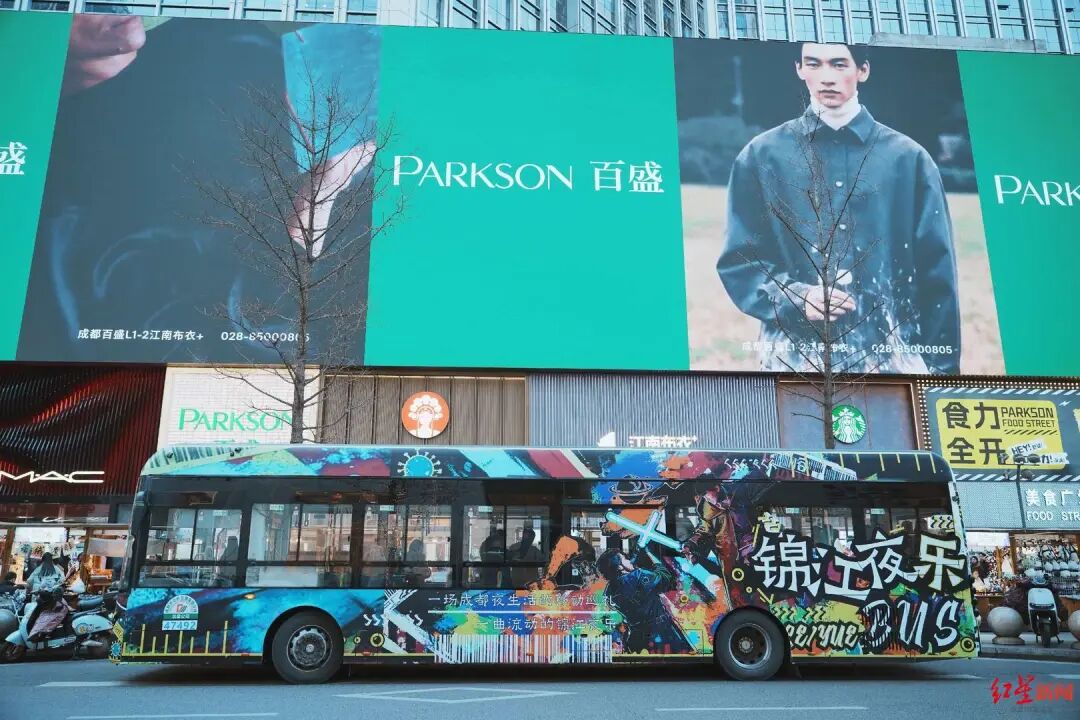该巴士从春熙路出发,途经太古里、合江亭、东门码头、安顺廊桥、339电视塔、活水公园等锦江沿线核心夜景地标,将成都的现代潮流与市井人文完美融合。车厢以赛博朋克风格打造,集结了本地特色商家资源,经典电影歌舞、民谣、R&B等不同曲风的音乐表演轮番上演,搭配特色美食与饮品,主持人NPC还会带领乘客开展趣味互动游戏,实现“吃喝玩乐”一站式体验。行驶途中,巴士与锦江游船水陆相映,游客可沉浸式感受成都夜生活的松弛与欢乐。