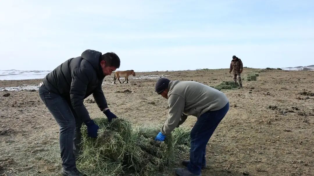 蒙坎和管护员正给野马投放饲料(龚向前/摄)