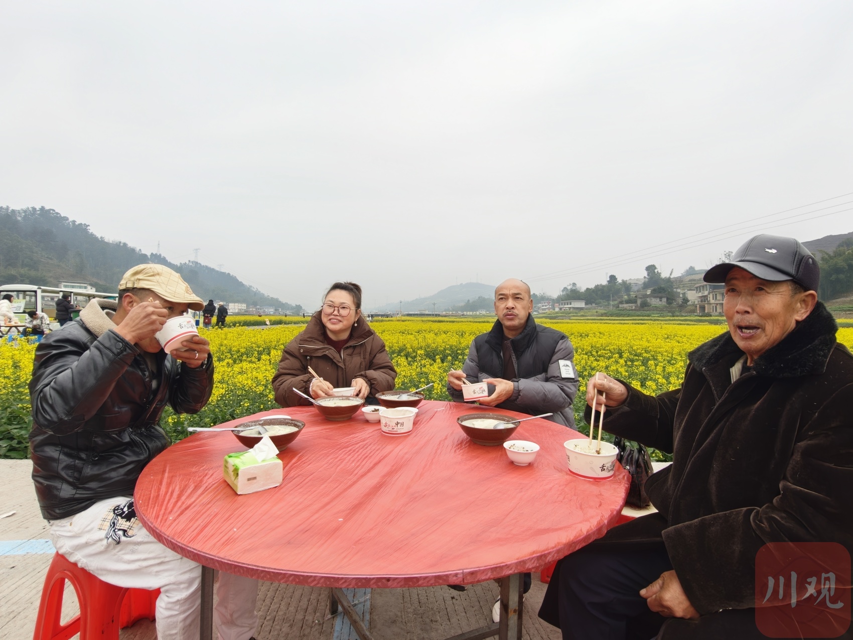 “在万亩花田里吃这个豆花饭太有感觉了。”正在吃饭的游客李文玉接过话头,一年都在广东打工,就想念家乡这口地道的滋味。李文玉是高县文江镇人,今天带着家里的长辈一起来看油菜花。“一路看一路逛,吃的喝的都很方便。”