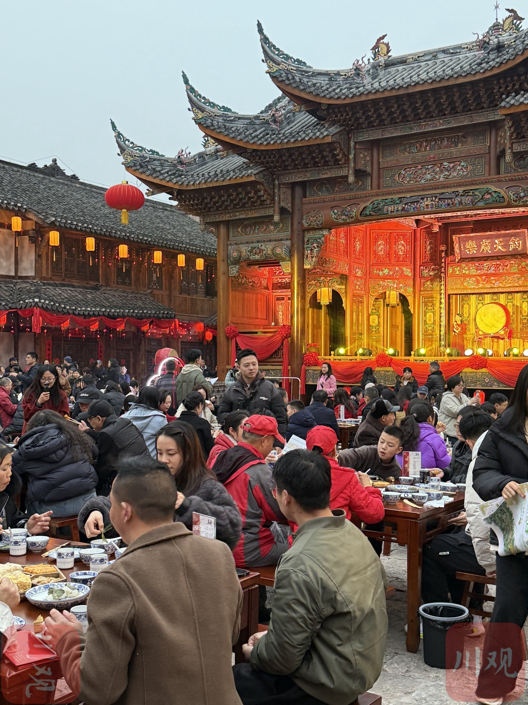 陪老婆回宜宾过年的厦门人陈先生刚动筷子,就忍不住赞叹:“昨天才在电视上看到‘川南请春酒’,今天就体验上了同款。第一次感受吃‘三台’的年夜饭,感觉比家乡的团年饭仪式感更足!”现场活动负责人告诉记者,春晚同款“川南请春酒”将持续至元宵节,市民游客可通过线上平台或现场预订。在此期间,“宜宾好市”新春集市以及花车巡游、NPC互动、国潮民乐、说书演绎等精彩表演也将轮番上演。