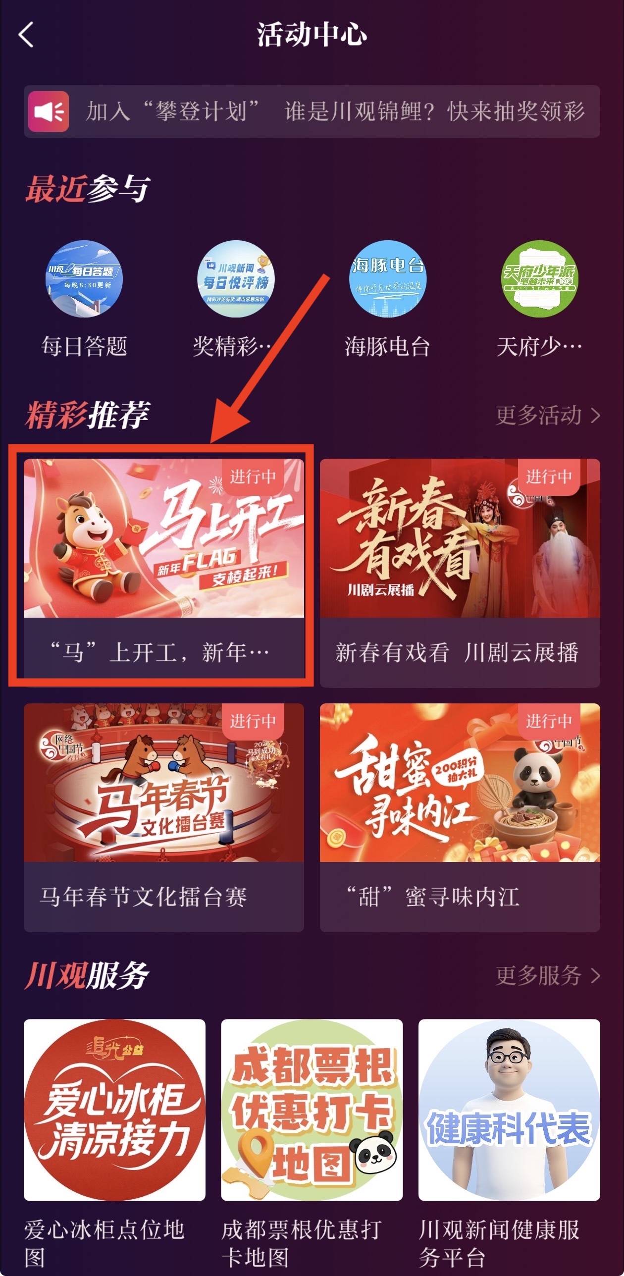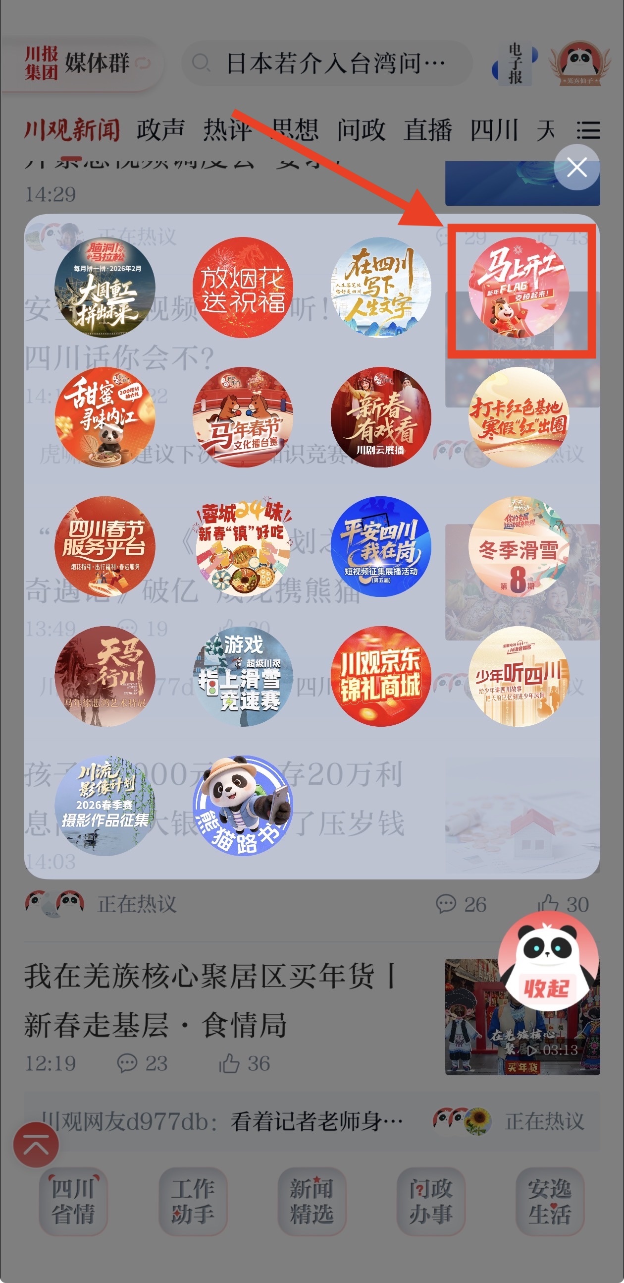 方式一:进入川观新闻,找到首页活动悬浮球,找到“‘马’上开工,新年FLAG支棱起来”活动图标点击参与。
