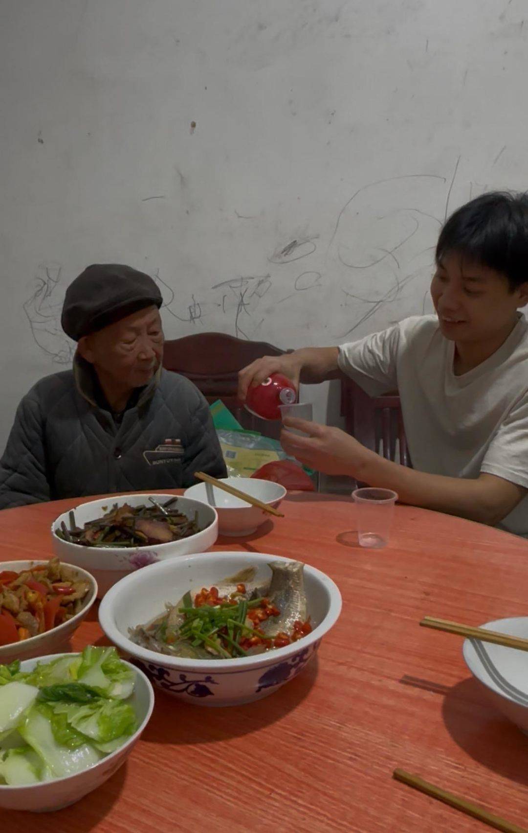 小叶正在给爷爷倒酒。