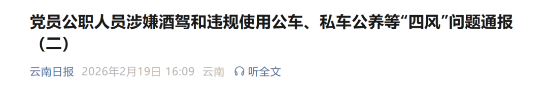 云南省纪委监委于2026年2月18日至2月22日期间,对云南省党员、公职人员涉嫌酒驾应当受到党纪政务处分和违规使用公务用车、私车公养的典型问题进行集中通报。现将3名党员、公职人员涉嫌酒驾问题通报如下: