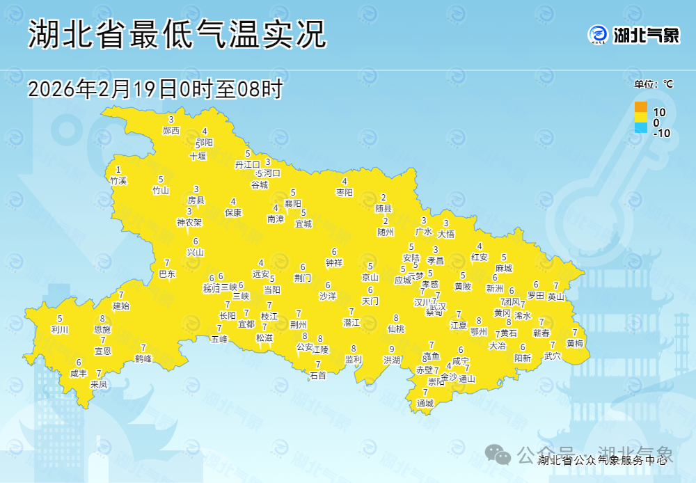 昨天(18日)全省以多云天气为主,恩施、荆州局地出现零星小雨,大部地区最高气温11~17℃。今天早上,全省大部仍以多云天气开场,最低气温1~8℃。