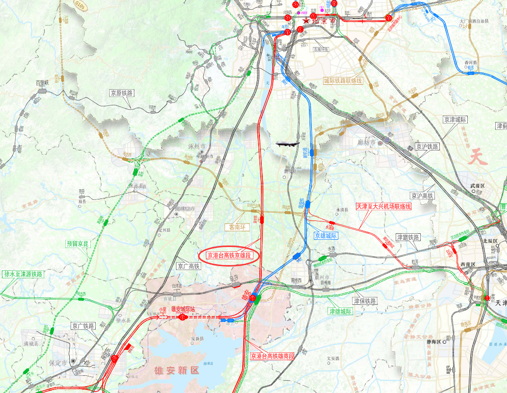 项目前期工作启动较晚,在2023年完成勘察设计招标和预可研编制,并作为储备开工项目纳入了2024年国家重点推进的铁路项目计划,目前也处于预可研待审查状态。受之于建设时序和筹资影响,其开工优先级在湖南省内目前排在黔吉和永清广高铁之后。加之湖南省去年又提出将长沙西至沪昆高铁连接线纳入国家规划,该线与益娄高铁同在娄底接轨,需进行统筹研究,预计在“十五五”中后期才会有实质性的进展。04 丰台至雄安新区高铁是原京雄商高铁的组成部分,连接北京丰台站与雄安站,设计时速350公里,线路长约90公里,中间设双辛东站。