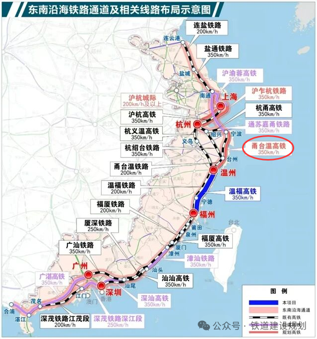 沿海通道上海经宁波至合浦段既有线,目前设计时速均为200-250公里/小时,正加快时速350公里复合通道的建设,目前全线仅剩余甬台温高铁还未纳入开工计划。