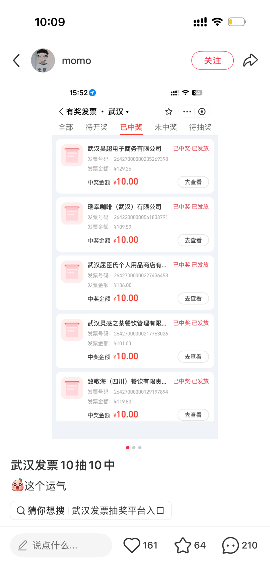 “10抽10中!”momo在小红书分享参加发票有奖活动,超高中奖率的经历。