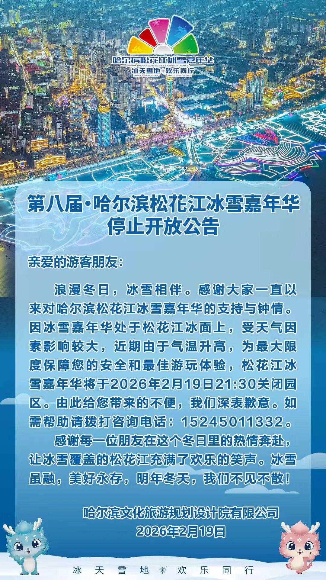 记者从哈尔滨文化旅游规划设计院有限公司获悉,因哈尔滨松花江冰雪嘉年华处于松花江冰面上,受天气因素影响较大,近期由于气温升高,为最大限度保障游客的安全和最佳游玩体验,第八届哈尔滨松花江冰雪嘉年华将于2月19日21时30分闭园。