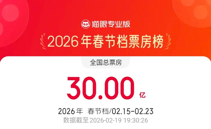 据网络平台数据,2026年春节档档期总票房(含预售)破30亿元,《飞驰人生3》《惊蛰无声》《熊出没·年年有熊》分列前三位。