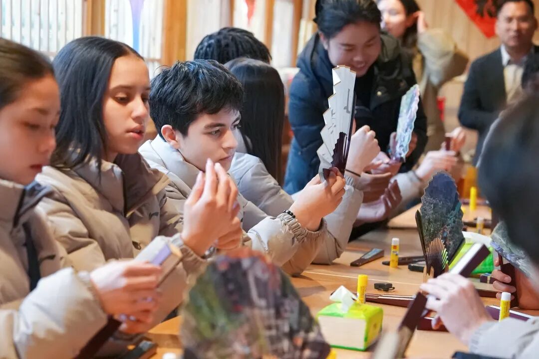美国青少年在梅水乡园村村尝试制作折扇。