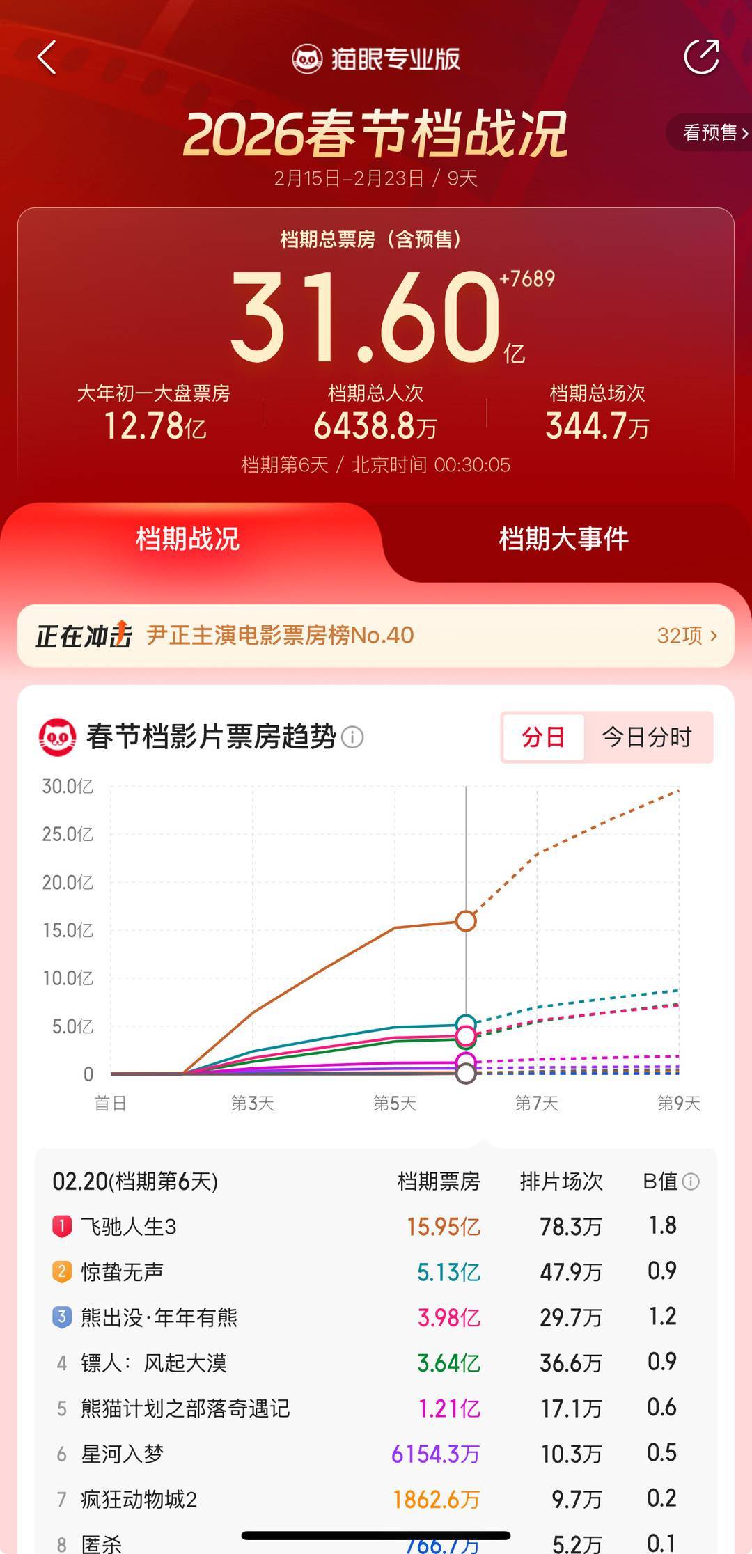 2月17日大年初一的单日票房达12.78亿,单日总场次数达59.5万场,刷新中国影史大年初一单日场次数纪录。同时,在春节档的带动下,2026年全年票房也于2月19日顺利超过50亿大关,达到了56.24亿。