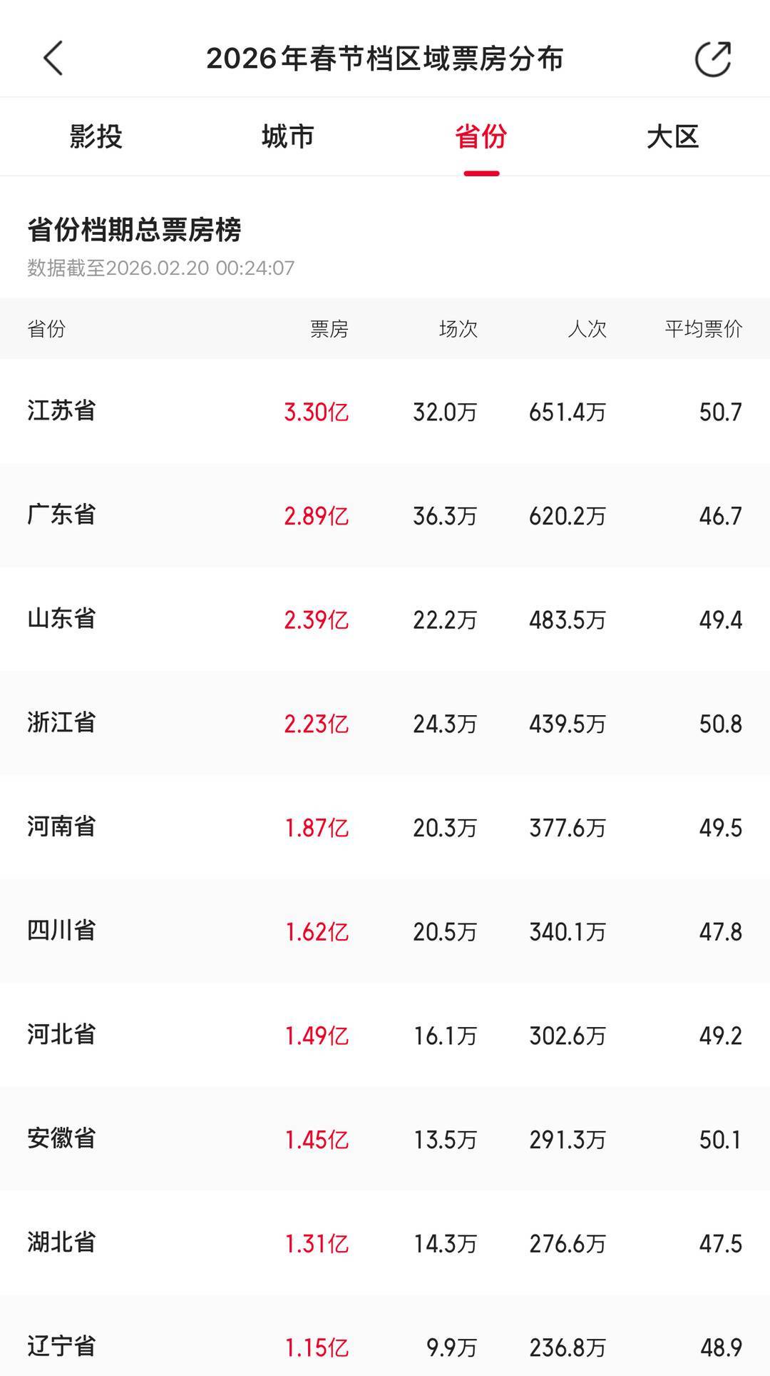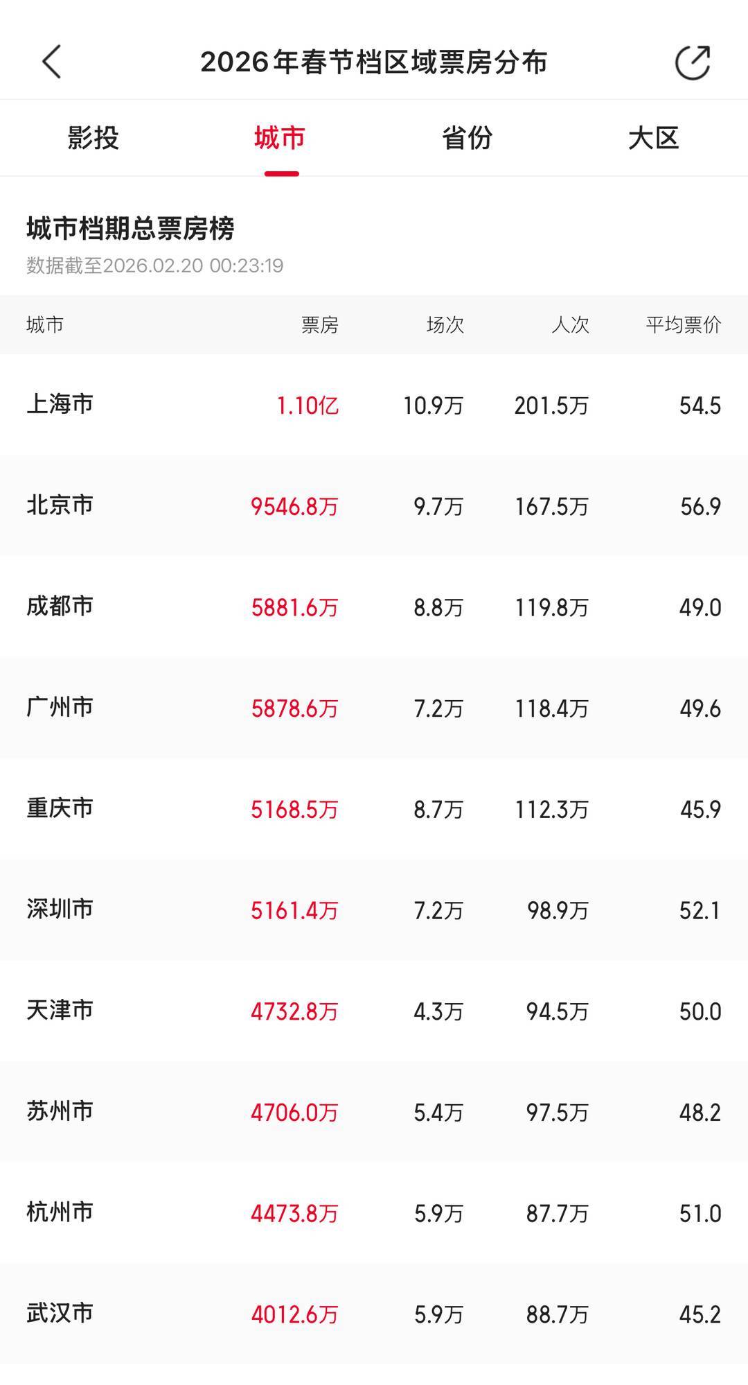 根据猫眼专业版数据,截至2月19日24时,2026年春节档(2.15-2.23)总票房超31亿。其中,2026春节档区域票房分布中,四川省以1.62亿位列第六,成都以5882.5万元的票房在城市档期总票房榜中位列第三。