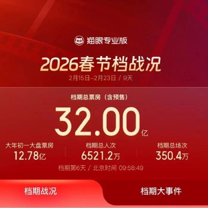 据猫眼专业版数据20日消息,2026年春节档档期总票房(含预售)破32亿,《飞驰人生3》《惊蛰无声》《熊出没·年年有熊》分列前三位。