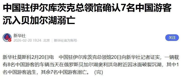 2月20日,俄罗斯贝加尔湖发生旅游车辆坠湖事件,车上有1名俄罗斯司机和8名中国游客,中国驻库茨克总领馆20日证实,其中1名中国游客逃生,其余7名中国游客溺亡。据当地媒体报道,当地政府虽然严禁车辆在该区域行驶,但这辆车还是上了冰,而且司机看到冰上裂缝后没有停车或转向,而是试图加速通过,导致这一事故发生。当地政府已经启动刑事调查。