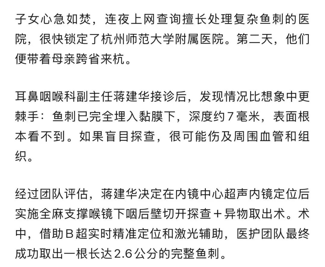 这根让李阿姨煎熬了11天的“暗刺”,仅耗时约1小时便被彻底清除,再次印证了专业处理的重要性。术后李阿姨恢复顺利,异物感与疼痛瞬间消失,不久便康复出院。