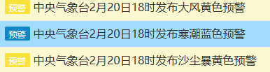 受冷空气大风影响,预计2月20日20时至21日20时,新疆东部和南部、内蒙古中西部、青海东北部、甘肃中西部、宁夏、陕西北部、山西、北京、天津、河北、河南北部、山东西部等地有扬沙或浮尘天气,其中,内蒙古西部、甘肃西部、宁夏北部、陕西北部等地的部分地区有沙尘暴,局部有强沙尘暴。