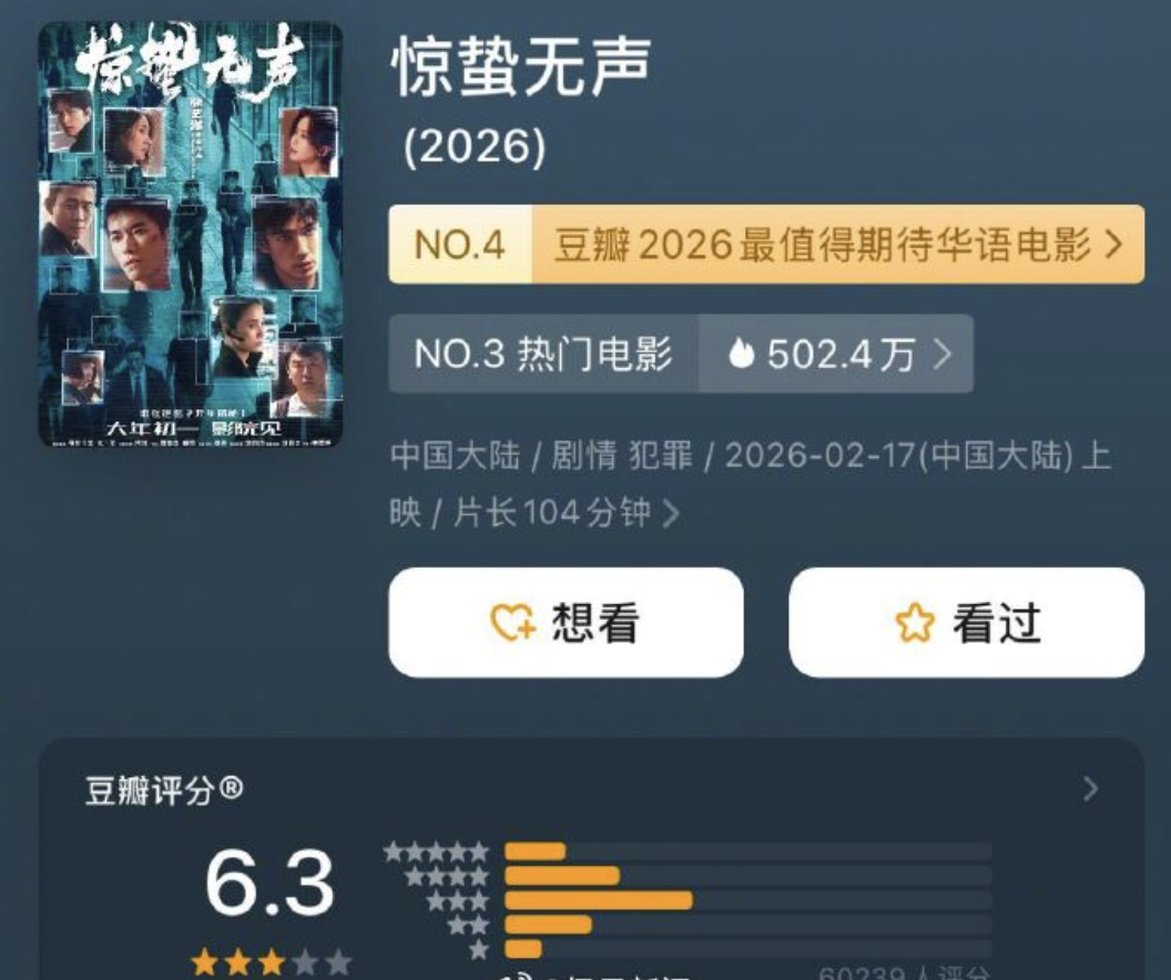 2月18日,让影迷多等了一会儿的《惊蛰无声》也收到了自己的豆瓣成绩单,不过,6.3分的开分表现让不少影迷表示意外。