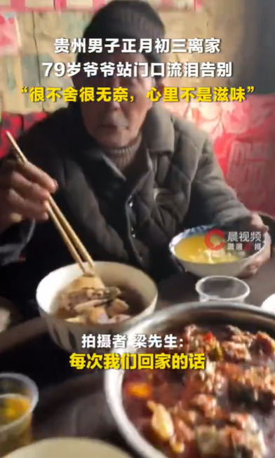 “即便万般不舍,也要勇往直前地走”。近日,贵州一男子发布春节假期结束,即将离家的视频。视频中,男子的爷爷站在屋外,哭着挥手告别。