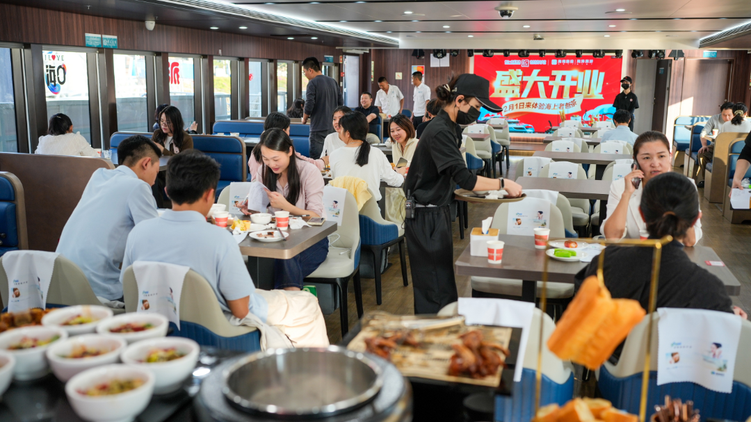图为游客在“海旅01”游船上喝老爸茶。张茂 摄