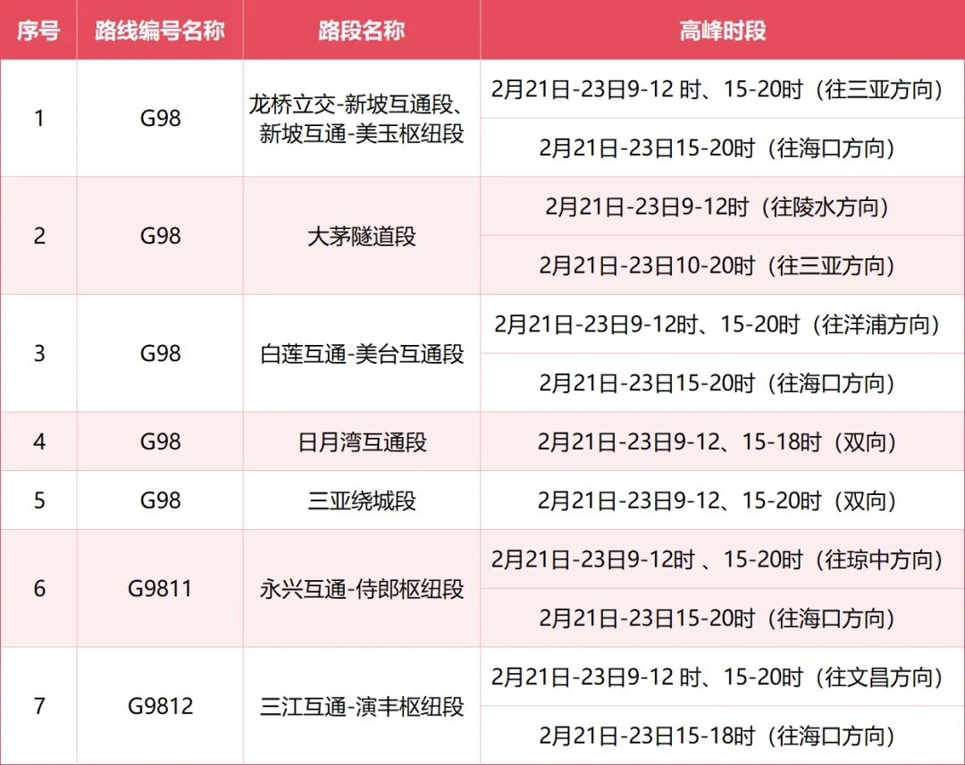 2月21日-23日期间,G98环岛高速龙桥立交-美玉枢纽段、三亚大茅隧道段、三亚绕城段、白莲互通-美台互通段的交通压力将持续处于高位。返程高峰期间,每天的车流高峰时段相对集中,建议大家尽量避开以下时段: