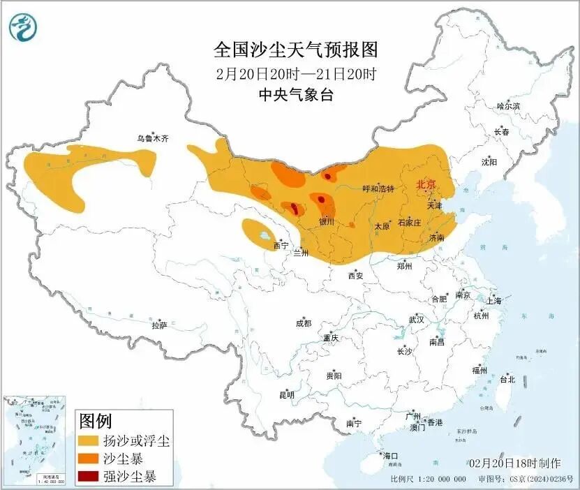 受冷空气大风影响,预计2月20日20时至21日20时,新疆东部和南部、内蒙古中西部、青海东北部、甘肃中西部、宁夏、陕西北部、山西、北京、天津、河北、河南北部、山东西部等地有扬沙或浮尘天气,其中,内蒙古西部、甘肃西部、宁夏北部、陕西北部等地的部分地区有沙尘暴,局部有强沙尘暴,中央气象台2月20日18时发布沙尘暴黄色预警。