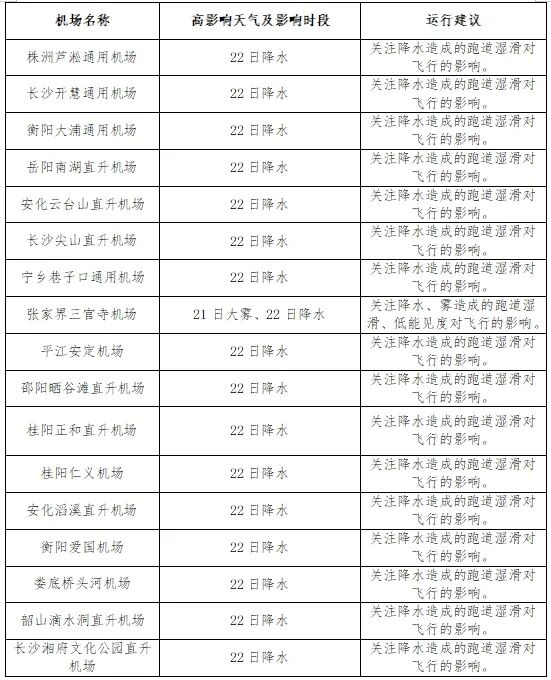 关注21日清晨湘北局地大雾及22日全省大部分地区降雨天气可能引起低能见度、跑道湿滑等对飞行的影响。