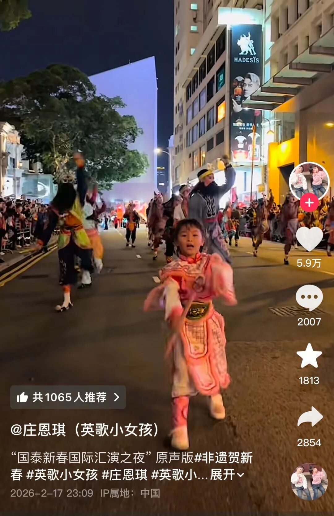 抖音账号“庄恩琪(英歌小女孩)”发布了