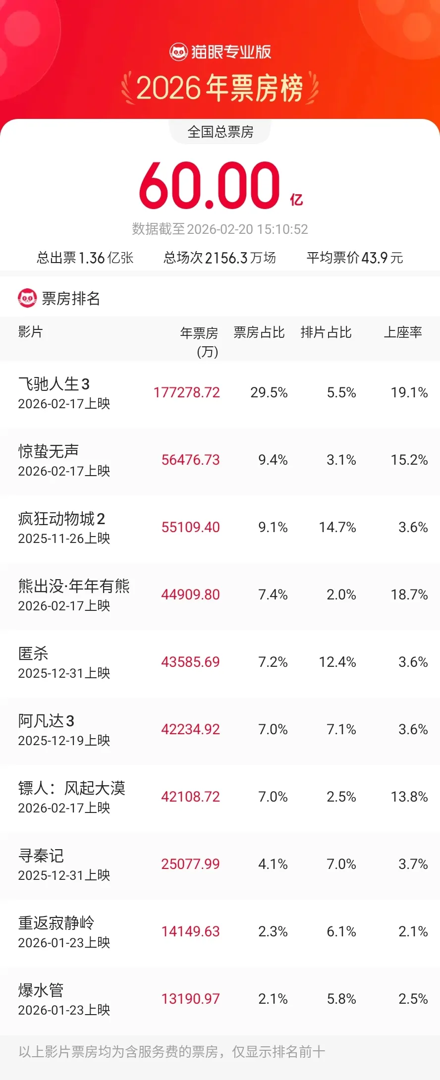 2026年年度电影总票房(含预售)