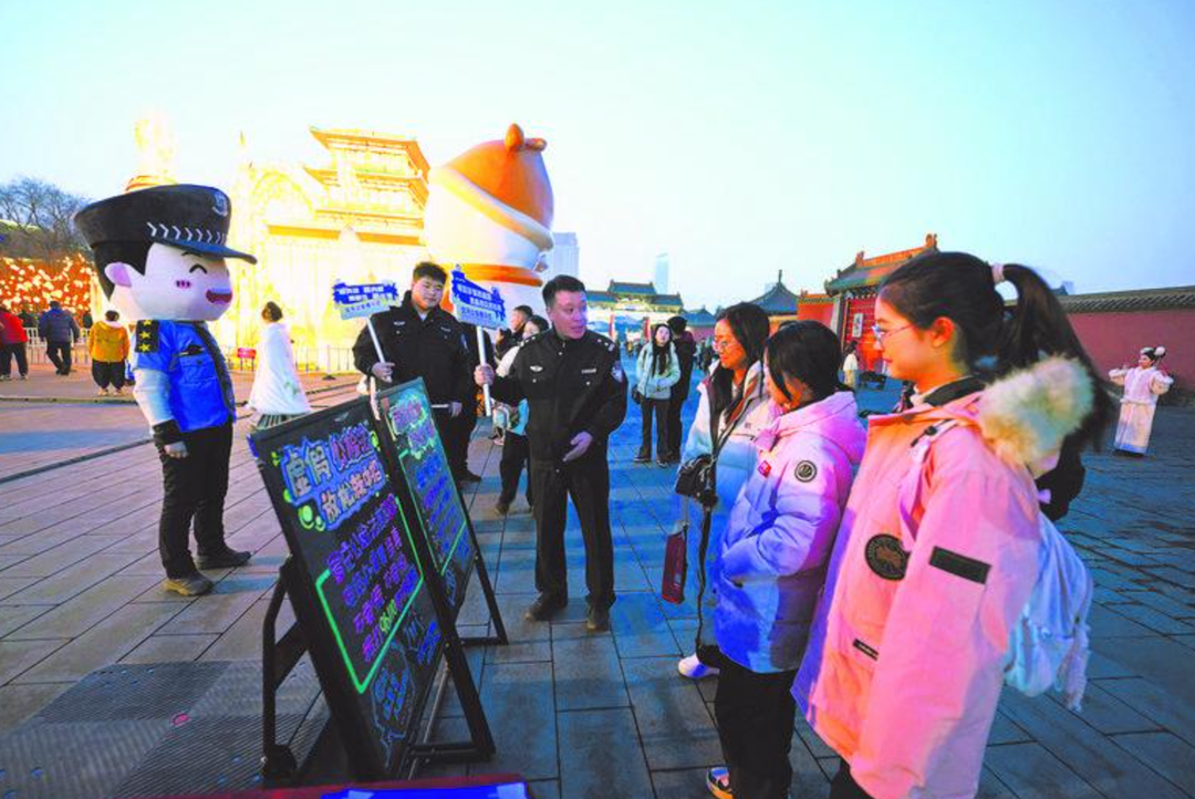2月17日,大年初一,沈阳市公安局沈河分局民警在中街方城景区设立便民服务站,守护市民与游客新春出行安全。图为民警面向群众开展反诈知识宣传。 赵敬东 摄