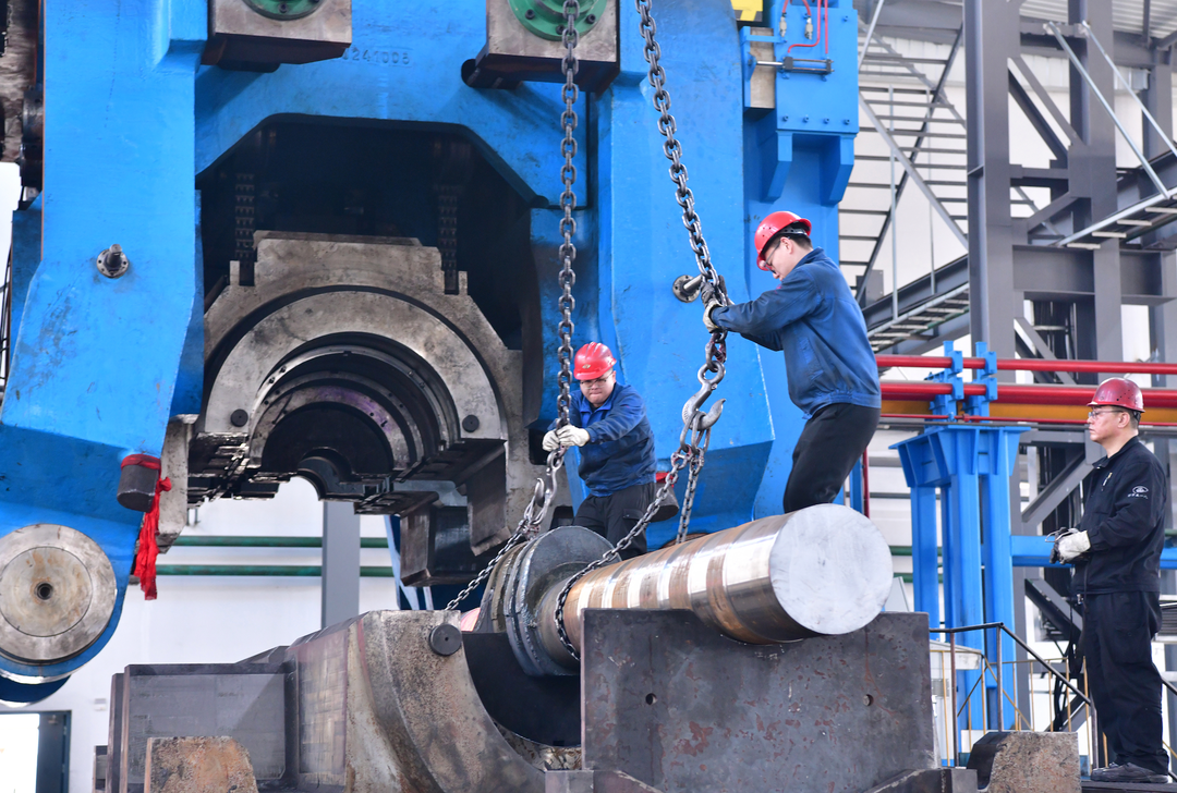 春节期间,辽宁五一八内燃机配件有限公司各生产车间机器运转不停。图为公司锻造分厂,大型镦锻船用曲轴生产线正在同步开展调试与生产作业。特约记者 刘海东 摄