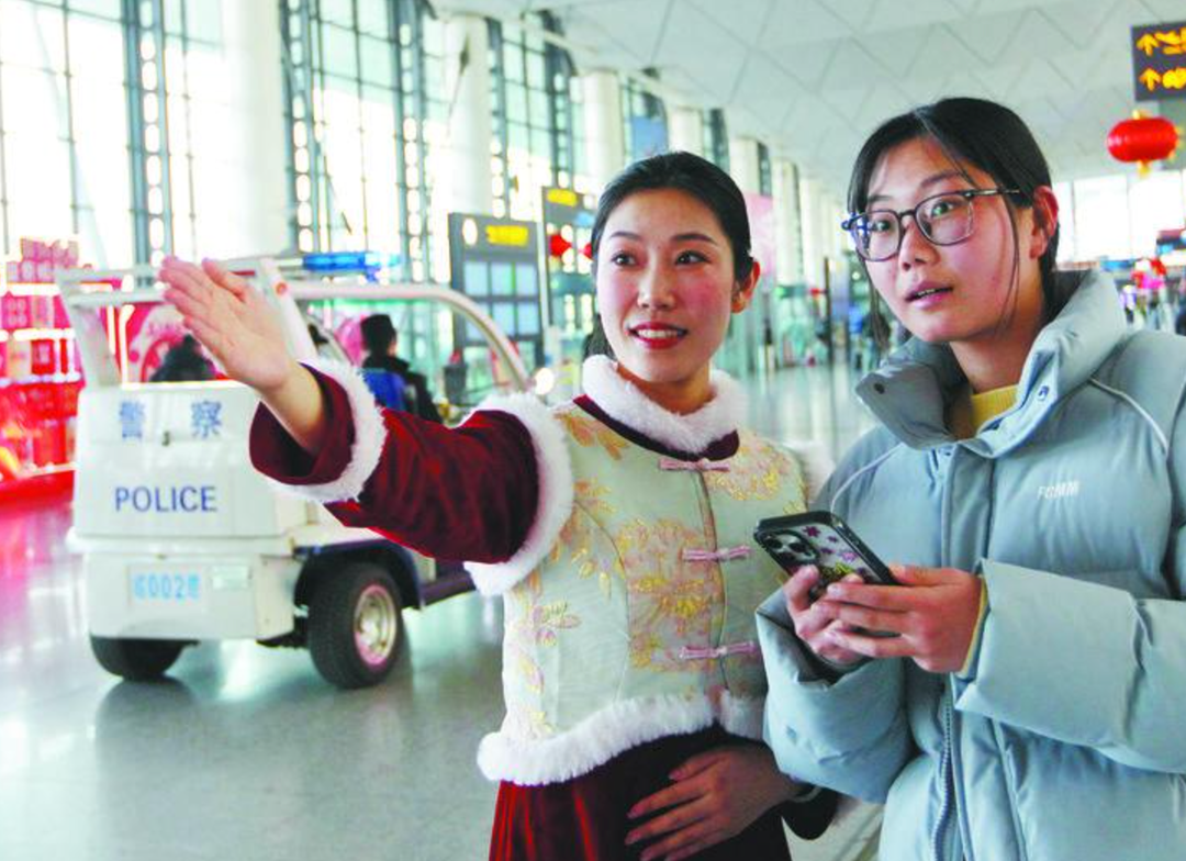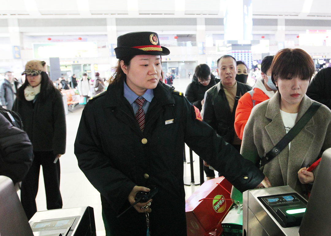 沈阳站客运三班客运值班员董羽宁,春节假期坚守岗位,用专业与耐心守护春运秩序。白琳 摄