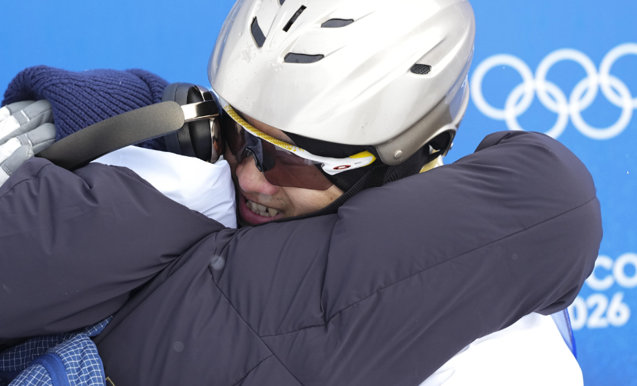▲2月20日,王心迪(右)和妻子徐梦桃在比赛中拥抱。新华社发
