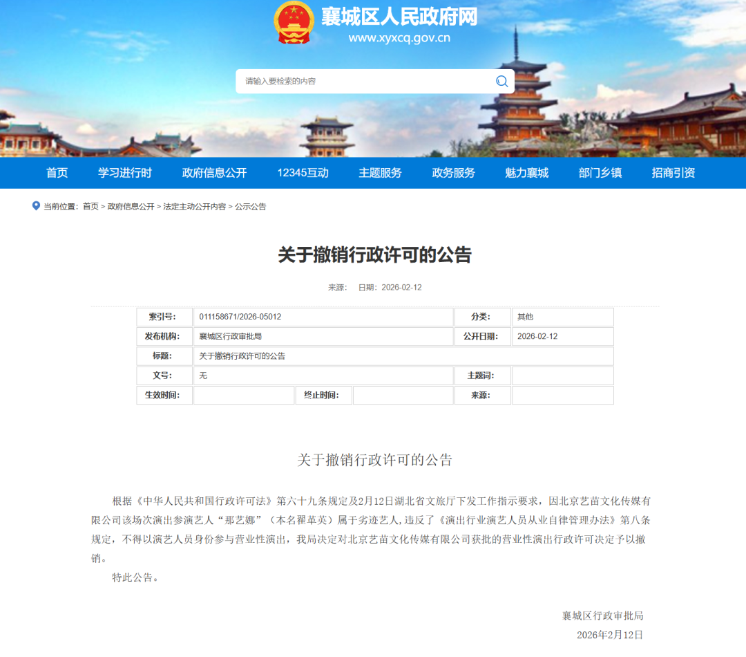 根据《中华人民共和国行政许可法》第六十九条规定及2月12日湖北省文旅厅下发工作指示要求,因北京艺苗文化传媒有限公司该场次演出参演艺人“那艺娜”(本名翟革英)属于劣迹艺人,违反了《演出行业演艺人员从业自律管理办法》第八条规定,不得以演艺人员身份参与营业性演出,我局决定对北京艺苗文化传媒有限公司获批的营业性演出行政许可决定予以撤销。