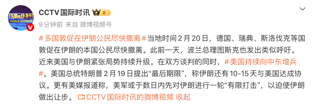 当地时间2月20日,德国、瑞典、斯洛伐克等国敦促在伊朗的本国公民尽快撤离。此前一天,波兰总理图斯克也发出类似呼吁。