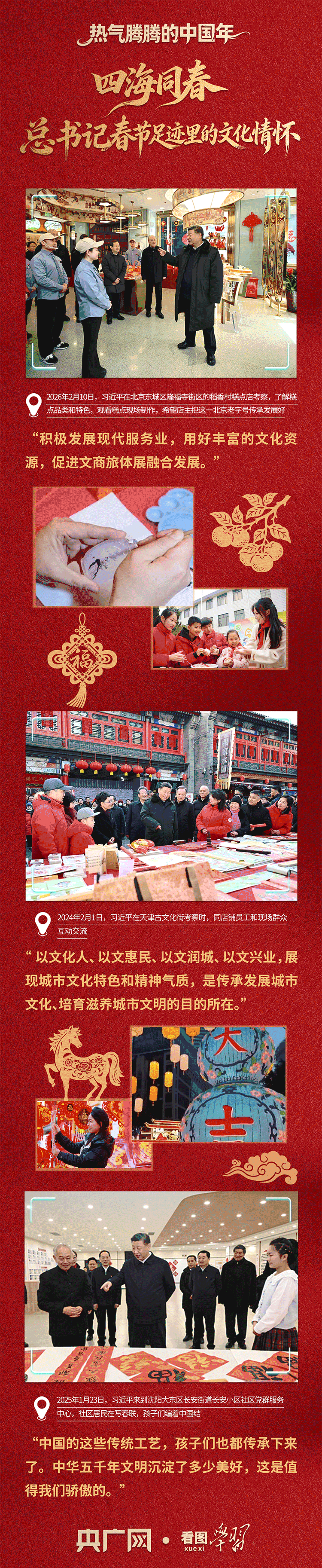 “加强文物保护和利用”“加强对国粹传承和非物质文化遗产保护的支持和扶持”“统筹好旅游发展、特色经营、古城保护”……一直以来,总书记高度重视中华优秀传统文化的保护、传承和利用,在春节考察足迹中饱含着深厚的文化情怀。