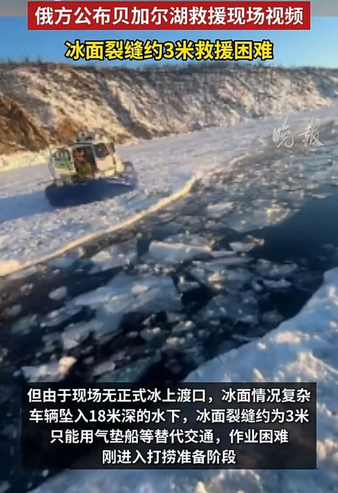 2月20日,俄罗斯紧急情况部出动救援队,已在现场持续作业,目前使用水下摄像头定位了车辆和7名遇难者遗体。但由于现场无正式冰上渡口,冰面情况复杂,车辆坠入18米深的水下,冰面裂缝约为3米,只能用气垫船等替代交通,作业困难。