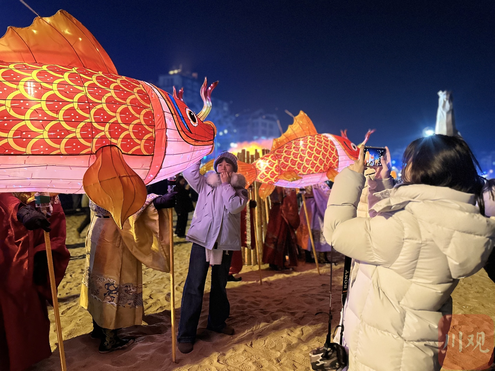 傍晚时分,海滩上以马年为主题的“赤骥”造型灯饰成为热门打卡点,吸引众多游客拍照留念。夜光舞狮腾跃献瑞,灵动鱼灯巡游送福,为海滩增添浓浓年味。国家级非物质文化遗产项目“打铁花”漫天绽放,火壶表演气势磅礴,赢得阵阵喝彩。压轴出场的无人机光影秀以“龙凤呈祥”造型点亮夜空,将现场气氛推向高潮。