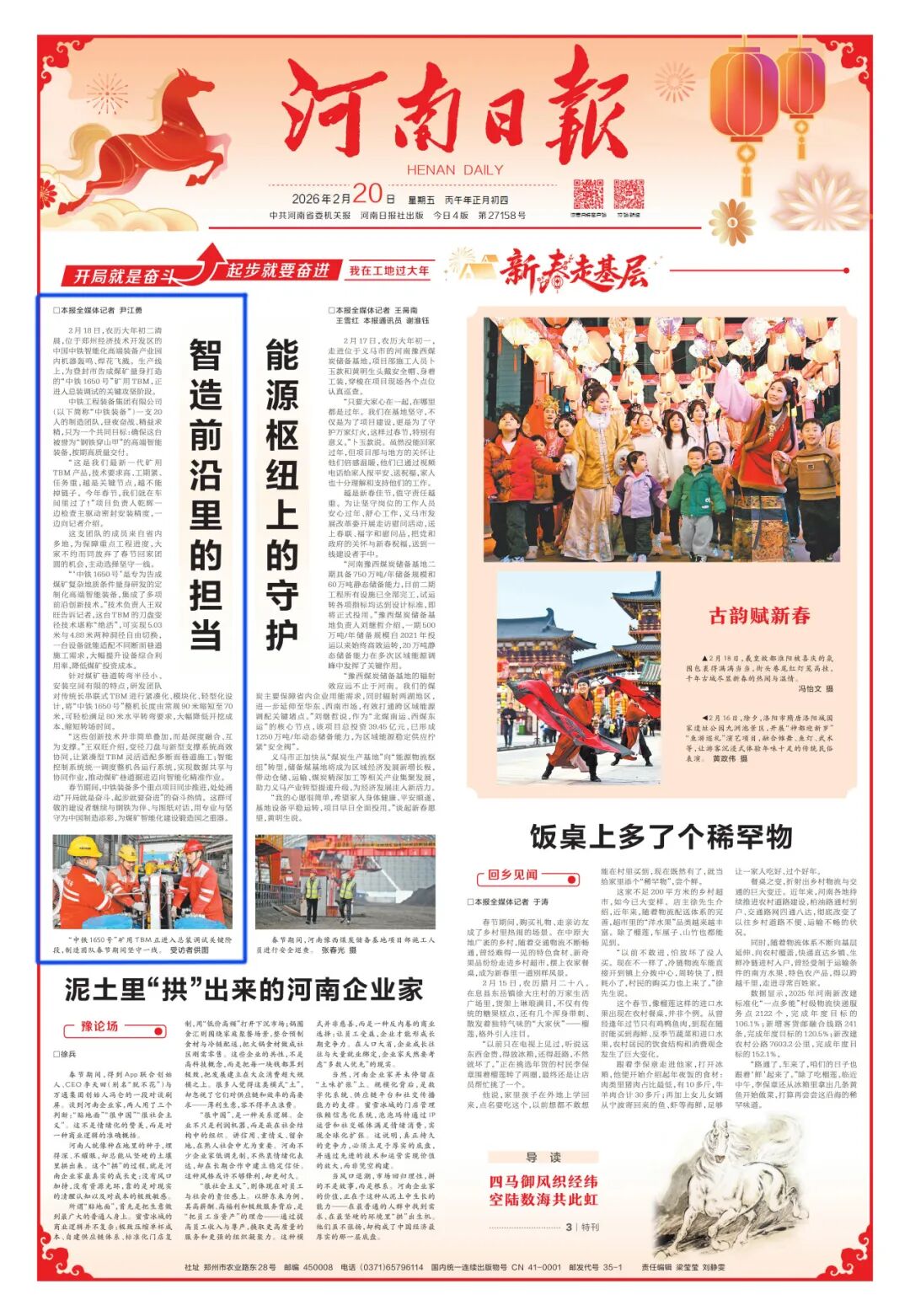 2月18日,农历大年初二清晨,位于郑州经济技术开发区的中国中铁智能化高端装备产业园内机器轰鸣、焊花飞溅。生产线上,为登封市告成煤矿量身打造的“中铁1650号”矿用TBM,正进入总装调试的关键攻坚阶段。