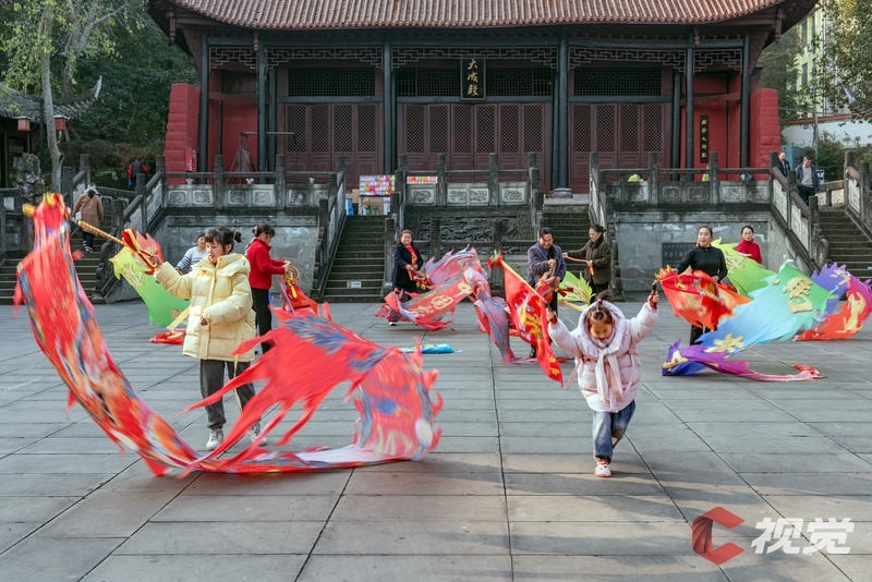 2月21日,资阳市安岳县文庙大院内龙舞欢腾、喜气洋洋,市民们挥舞着印有“龙马精神”“中国龙”字样的彩龙。C视觉签约摄影师 杨康忠 摄
